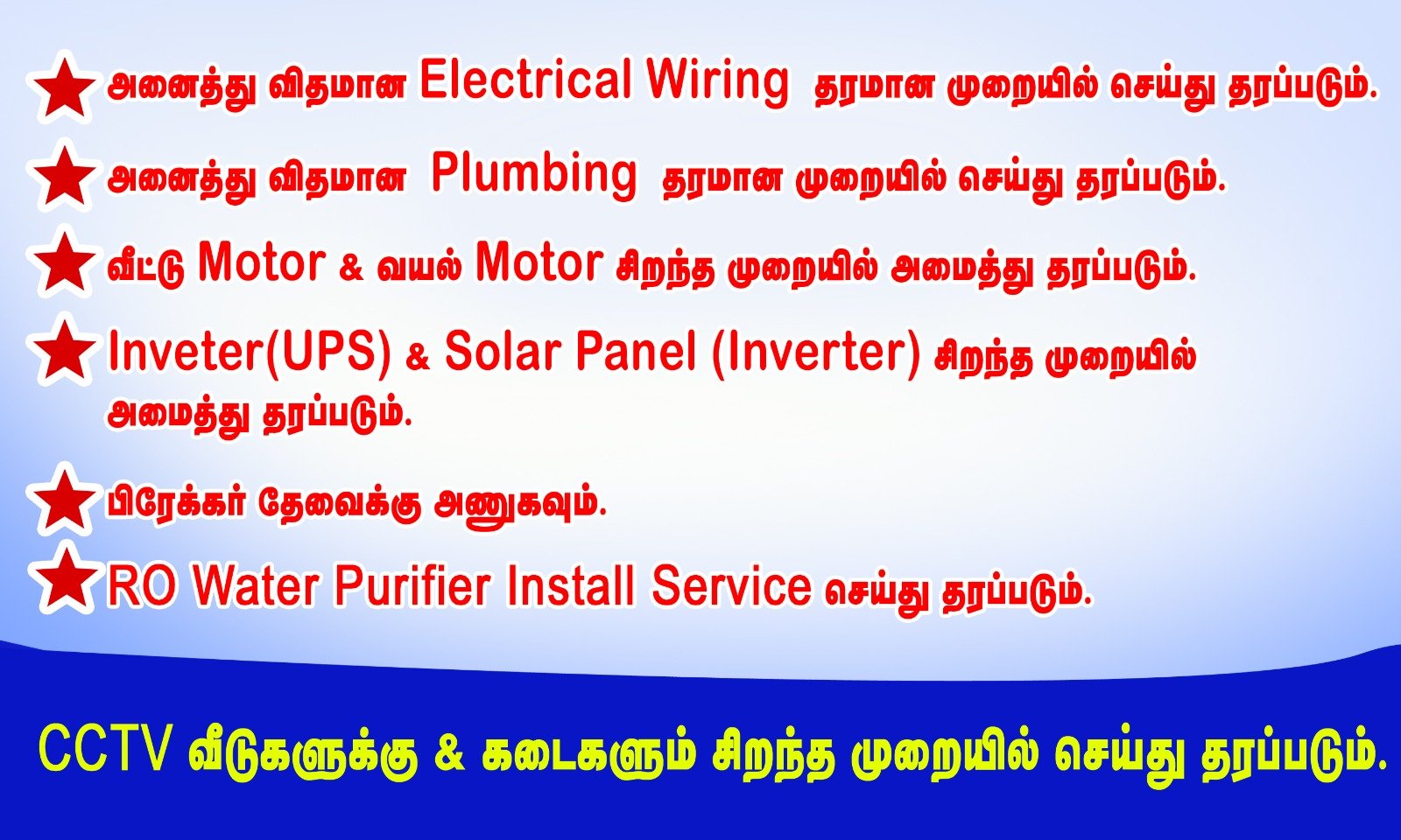 நாங்கள் சிறந்த முறையில் எலக்ட்ரிக் மற்றும் பிளம்பிங் ஒர்க்ஸ் வாடிக்கையாளரின் விருப்பத்திற்க்கேற்ப செய்து தருகிறோம் .