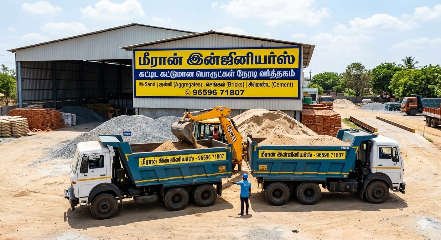 கட்டிடம் கட்டுமானத்திற்கு தேவையான செங்கல் மணல் ஜல்லி எம்சாண்ட் பிசாண்ட் Readymix கான்கிரீட் பிரிக்ஸ் steel எந்தவிதமான பொருள்கள் இருந்தாலும் நேரடி வர்த்தகம் அதாவது தயாரிக்கின்ற இடத்தில் இருந்து அனுப்பக்கூடிய ஆல் ஓவர் தமிழ்நாடு நிறுவனம்.