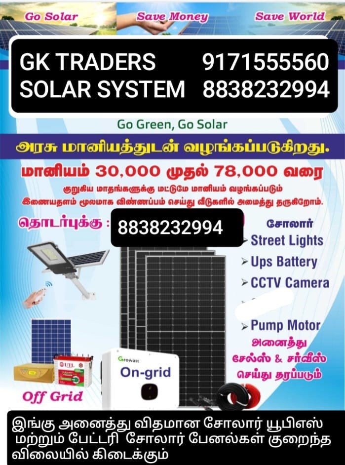அக்வா, ரோ வாட்டர், யுபிஎஸ், சோலார், ஹீட்டர், எல்இடி டிவி சர்வீஸ், பேன் , யுபிஎஸ் பேட்டரி, RO ஃபில்டர் போன்ற அனைத்தும் சிறந்த முறையில் சேல்ஸ் & சர்வீஸ் செய்து தருகிறோம்.