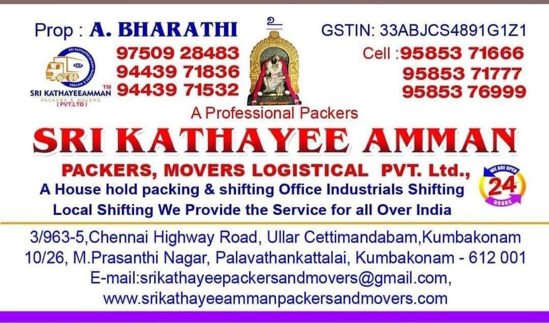 Sri Kathayee Amman Packers and Movers Logistical Pvt Ltd is promoted by A.Bharathi Saravanan at Kumbakonam. We work hard to provide excellent customer service to all our clients.