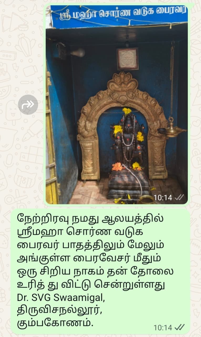 நான் தாராசுரத்தில் காய்கறி கடை வைத்து இருந்தேன். கோரானா காலத்தில் தொழில் முடங்கியது. இரண்டரை வருட கோரானா காலத்தில் திறந்திருந்த ஒரே கோயில் ஸ்ரீவேம்பூச்சித்தர் கட்டிய ஸ்ரீமஹா சொர்ணாகர்ஷன பைரவர் கோயில் Detail
