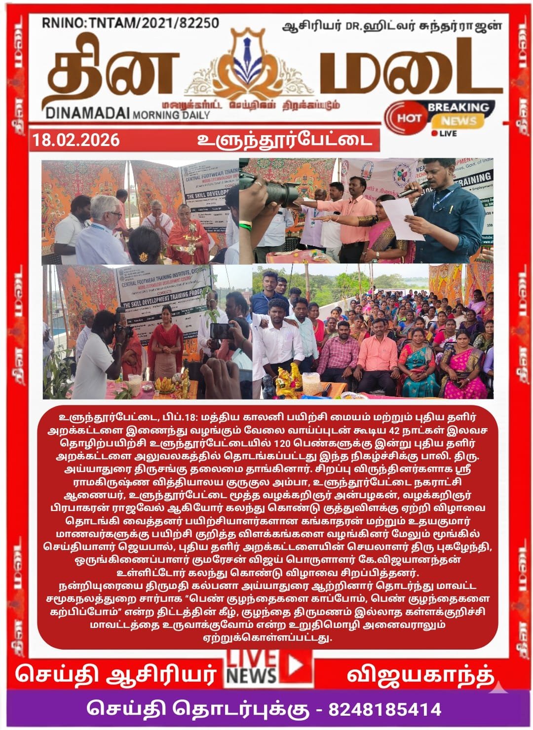 18. 02.2026 இன்று மத்திய காலனி பயிற்சி மையம் மற்றும் புதிய தளிர் அறக்கட்டளை இணைந்து வழங்கும் வேலை வாய்ப்புடன் கூடிய 42 நாட்கள் இலவச தொழிற்பயிற்சி உளுந்தூர்பேட்டையில் 120 பெண்களுக்கு இலவச பயிற்சி இன்று புதிய தளிர் அறக்கட்டளை அலுவலகத்தில் தொடங்கப்பட்டது