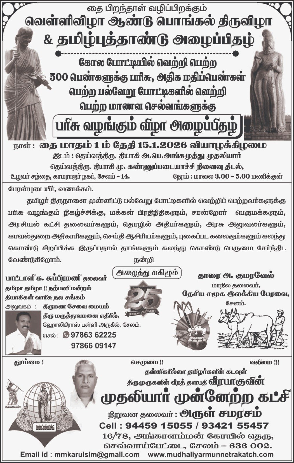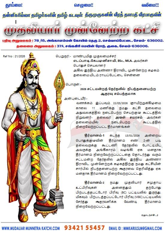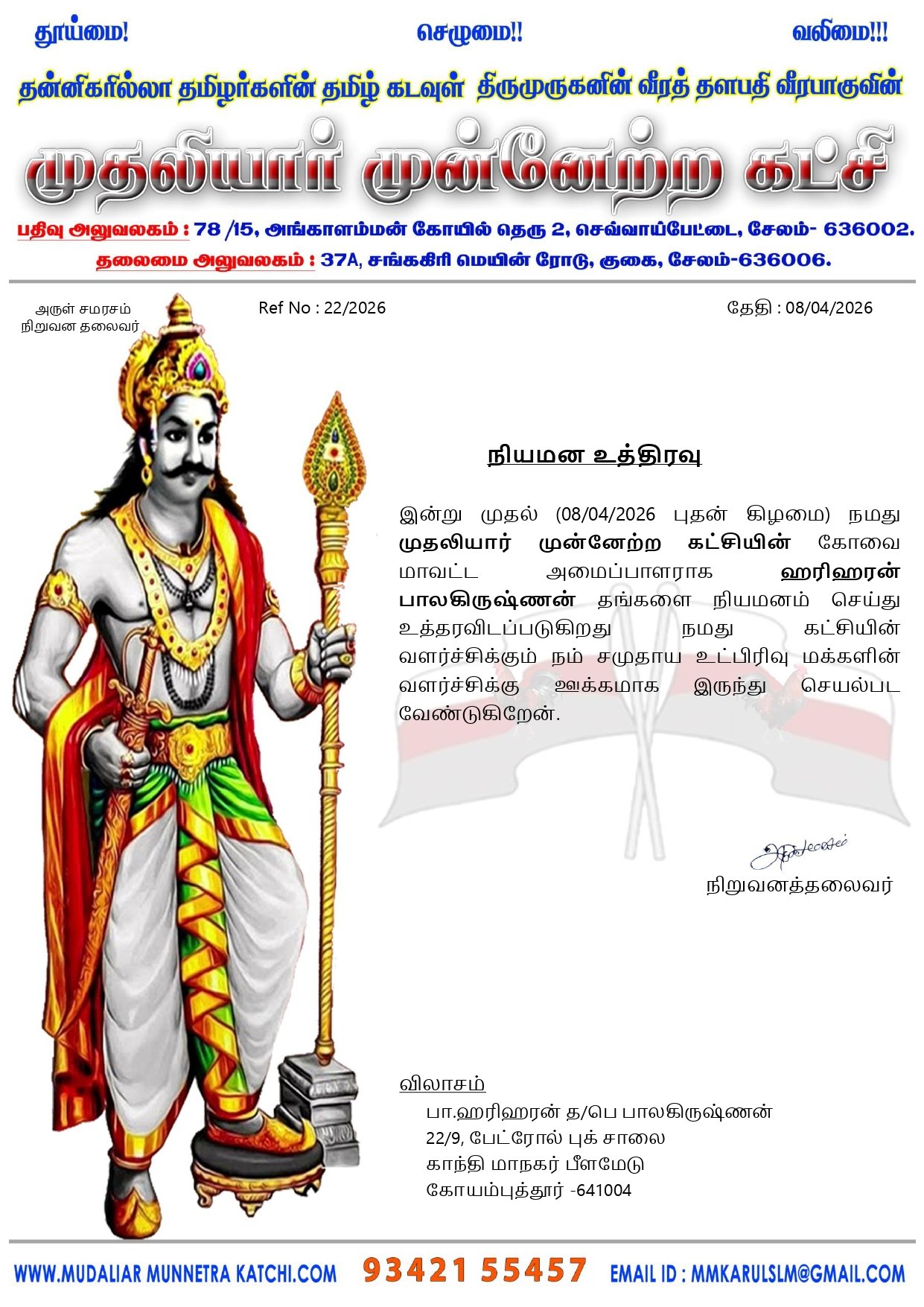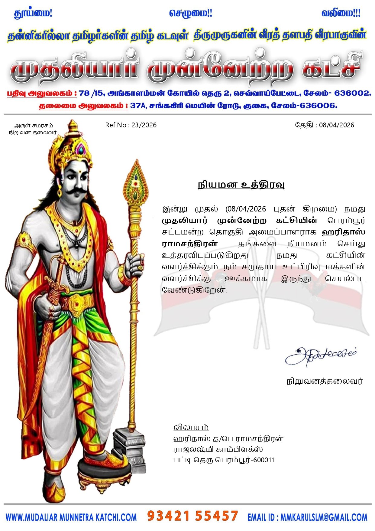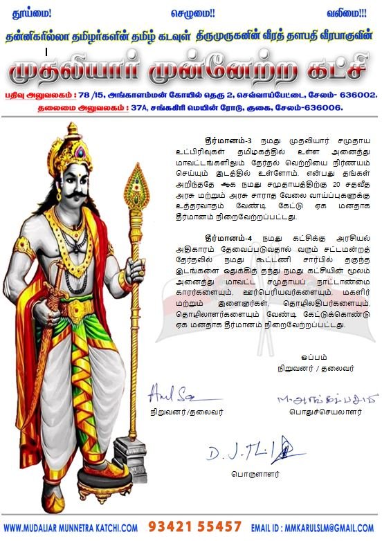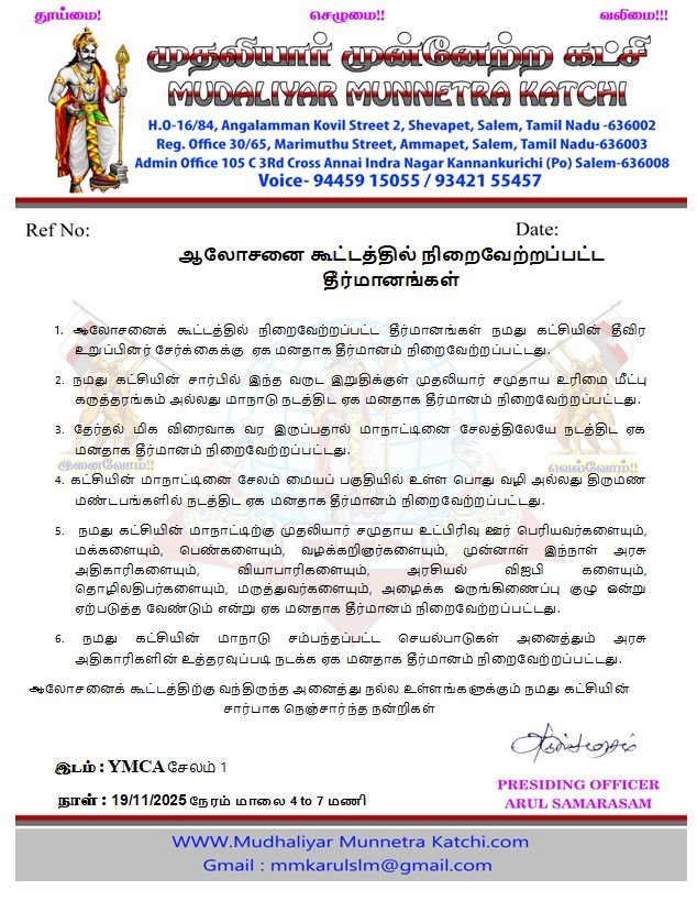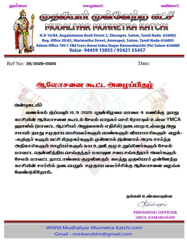 Mudhaliyar Munnetra Katchi is promoted by Mudaliyar Munnetra Katchi at Salem. We work hard to provide excellent customer service to all our clients.