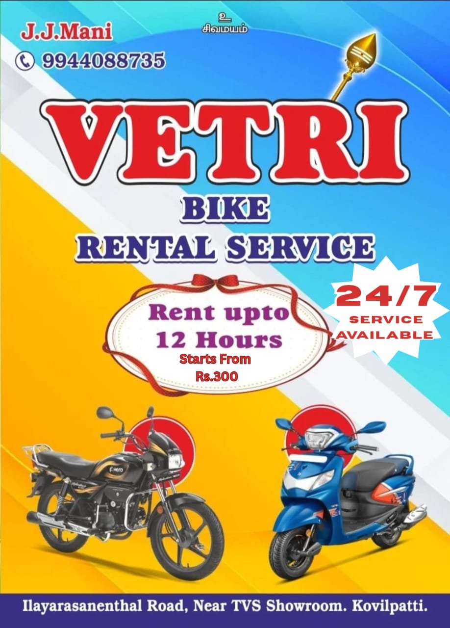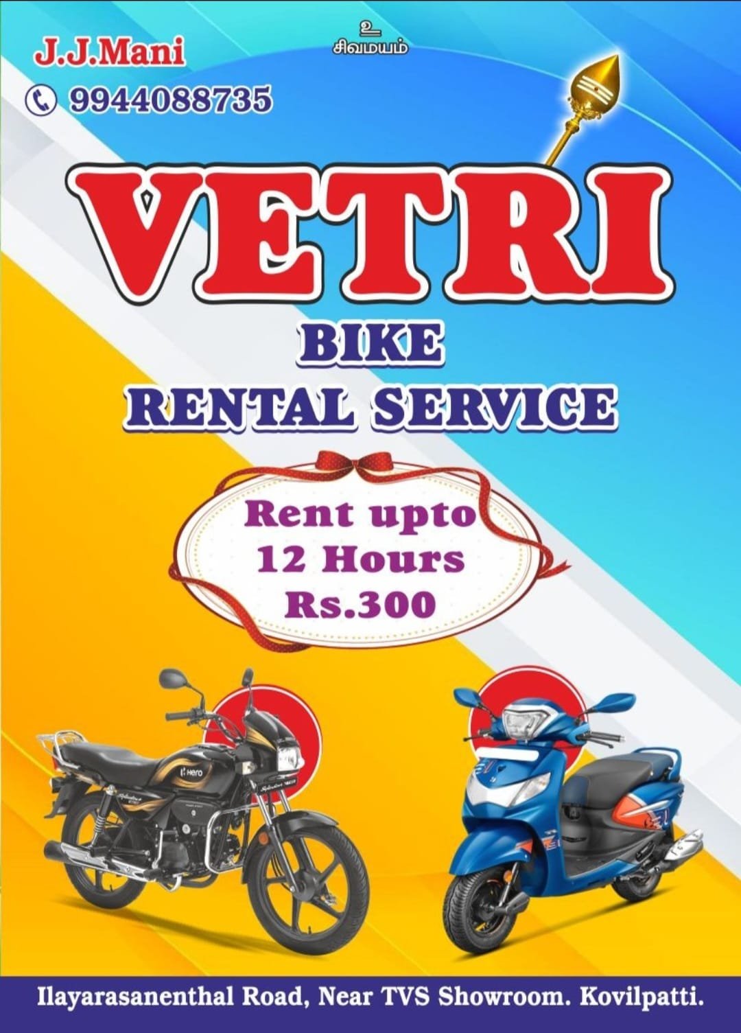 Vetri Two Wheeler Vehicle Rental Station is promoted by J.J.Mani at Kovilpatti. We work hard to provide excellent customer service to all our clients.