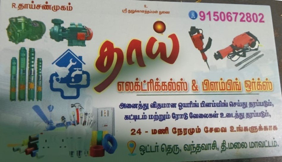 Thaai Electricals & Plumbing Works is promoted by R.Thaaishanmugam at Vandavasi. We work hard to provide excellent customer service to all our clients.