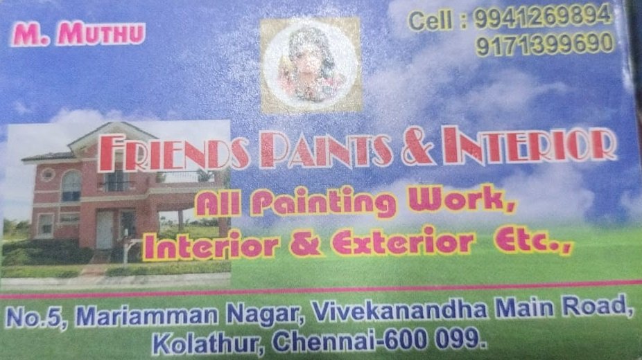 Friends Paints & Interior is promoted by M.Muthu at Chennai. We work hard to provide excellent customer service to all our clients.