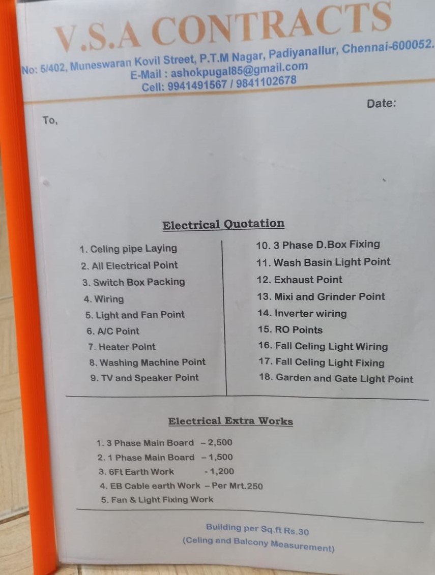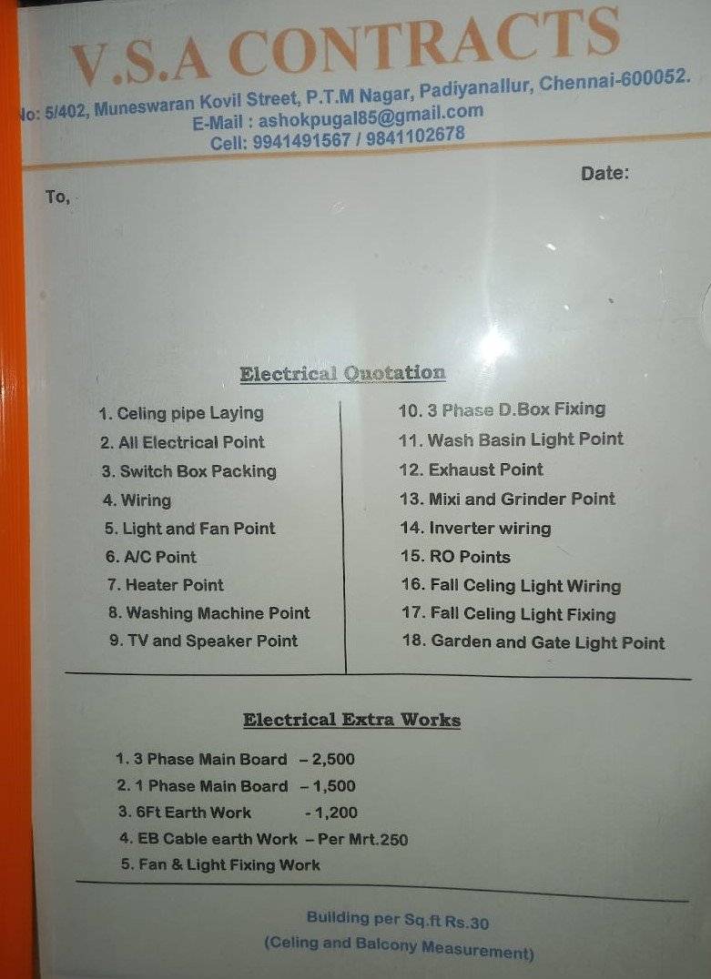 சென்னையில் எலக்ட்ரிகல் ஒர்க்ஸுக்கு முதன்மையான ஒரே இடம் V.S.A Contracts-க்கு உங்களை வரவேற்கிறோம்!