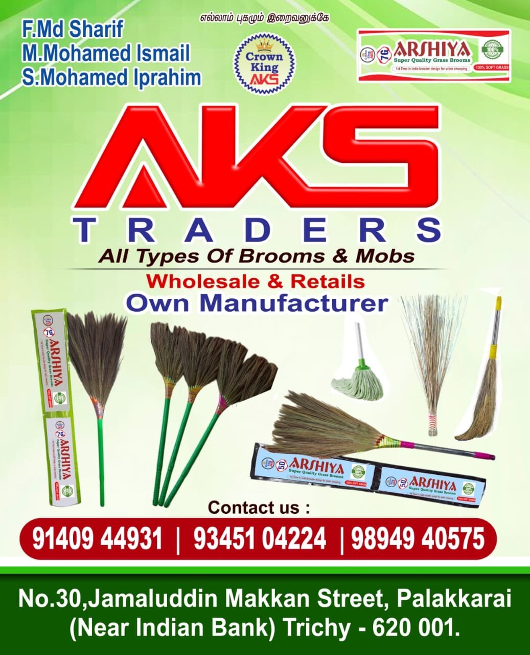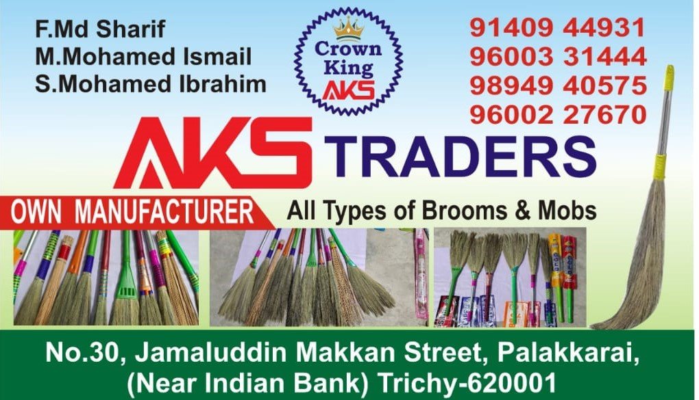 2. AKS Traders: No. 30, ஜமாலுதீன் மக்கன் தெரு, பாலக்கரை (இந்தியா வங்கி அருகில்), திருச்சி - 620001.