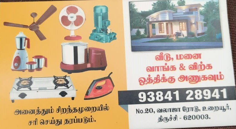 நாங்கள் அனைத்து விதமான எலெக்ட்ரிக்கல் மற்றும் பிளம்பிங் வேலைகள் அனைத்தும் சிறந்த முறையில் செய்து தருகிறோம். வயரிங் ஒர்க்ஸ், இன்வெர்ட்டர் வயரிங், பிளம்பிங் ஒர்க்ஸ் மற்றும் ஜன்னல் கொசுவலை, சீலிங் ஃபேன், டேபிள் ஃபேன், மிக்சர் ஜார், கிரைண்டர், குக்கர், கேஸ் ஸ்டவ் சர்வீஸ், மோட்டார் ரீவைண்டிங், ஃப்ரிட்ஜ் ஸ்டெபிலைசர் அனைத்தும் சிறந்த முறையில் சர்வீஸ் செய்து தரப்படும்.