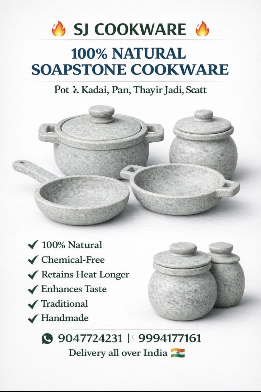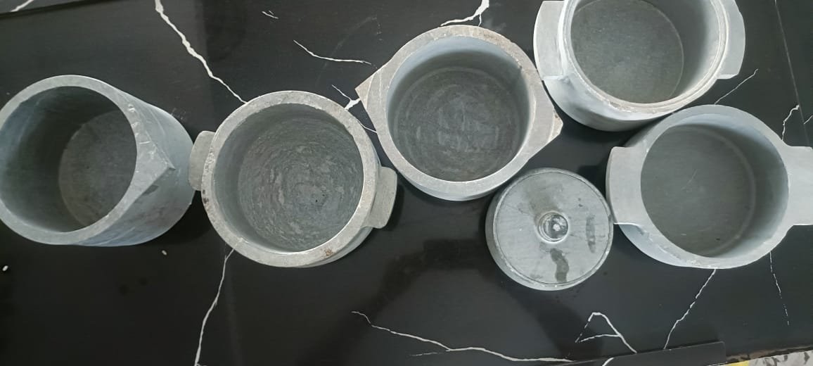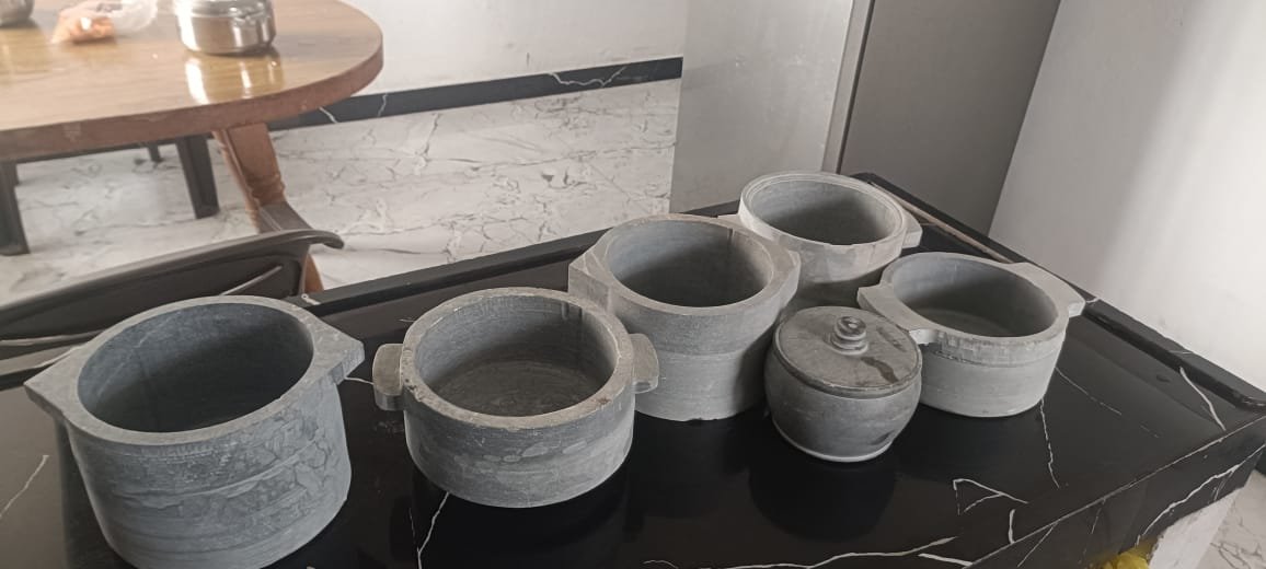 All types of cooking utensils made from pure white stone are available in Mangalore. Stone pots, pans, paniyaram pans, curd jars, kadai, hot box model stone pots, dosa griddles, and all other cooking utensils are available. Delivery is available throughout India.