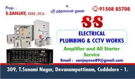 SS Electrical Plumbing & CCTV Works is promoted by S.Sanjay at Cuddalore. We work hard to provide excellent customer service to all our clients.