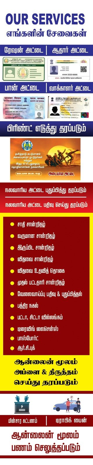 எங்களிடம் அனைத்து வகையான ஆன்லைன் சர்வீஸ், கொரியர் & கார்கோ சர்வீஸ், வாட்டர்கேன் சர்வீஸ், மற்றும் டாடா ஏஜ் வாடகை உள்ளிட்ட அனைத்து சேவைகளும் சிறந்த முறையில் செய்து தரப்படும்.