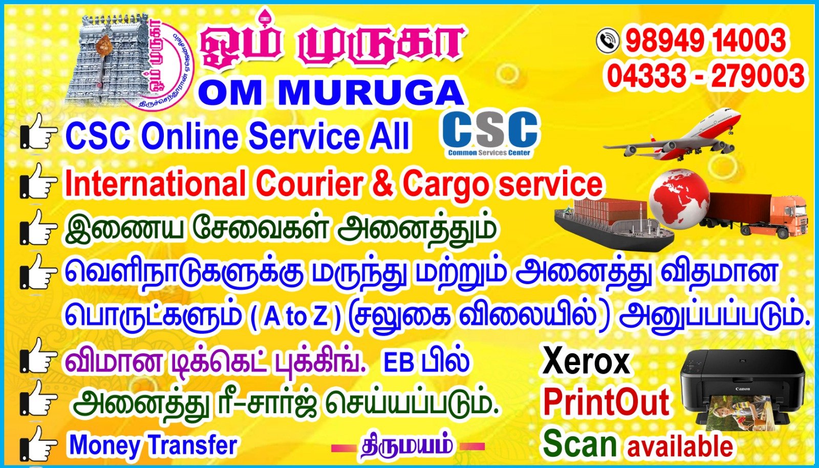At Om Muruga Service, we combine reliability, affordability, and customer satisfaction to make everyday tasks easier. Whether it’s online documentation, courier needs, or local services, we are here to serve you with excellence.