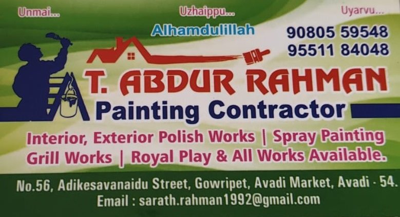 Abdur Rahman Painting Contractor is promoted by T.Abdur Rahman at Avadi. We work hard to provide excellent customer service to all our clients.