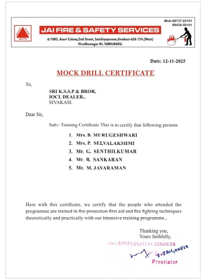நாங்கள் ஐஎஸ்ஐ முத்திரையிடப்பட்ட தீயணைப்புக் கருவிகள் அனைத்தும் சிறந்த முறையில் சேல்ஸ் & சர்வீஸ் செய்து தருகிறோம்.
