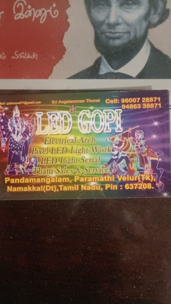 Welcome to LED Gopi, your trusted partner in Namakkal for LED lighting solutions and event services. We specialize in providing Electric Arches, Pixel LED Light Works, LED Light Serials, and Thatti setups for a wide range of occasions.