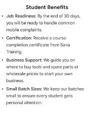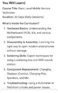 எங்களிடம் அனுபவம் வாய்ந்த ஆசிரியர்களை ஹார்ட்வேர் பேஸிக்ஸ், டிஸ்அசம்பலி & அசம்பலி, சால்டரிங் ஸ்கில்ஸ், காம்போனென்ட் ரிப்ளஸ்ட்மென்ட், ட்ரப்ள்ஷூட்டிங் உள்ளிட்ட அனைத்து வகையான மொபைல் ரிப்பேர் பயிற்சி சிறந்த முறையில் அளிக்கப்படும்.