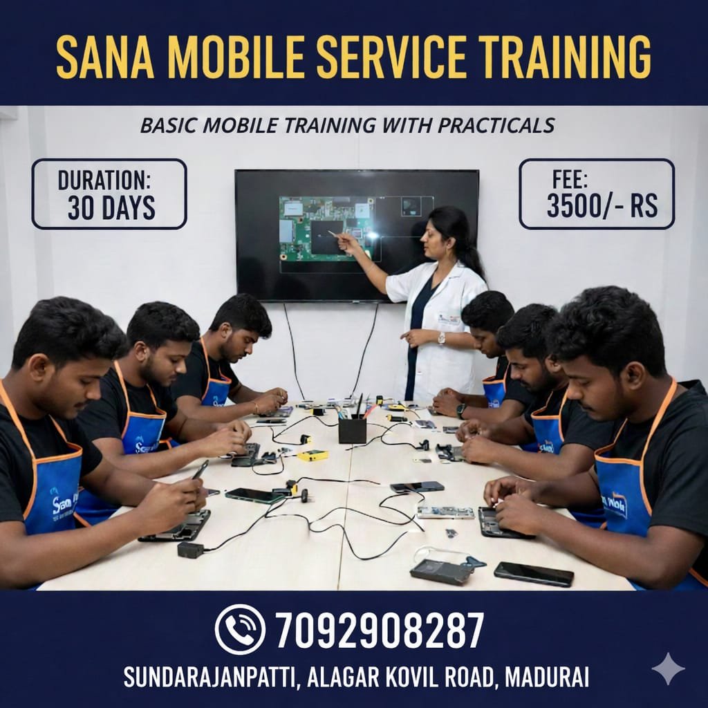 Welcome to Sana Mobile Service Training, Madurai’s trusted institute for mobile repair education. In today’s smartphone-driven world, mobile servicing is one of the most stable and profitable career paths. Our 30-day intensive program equips you with the confidence and skills to start your own repair shop or work in a professional service center.