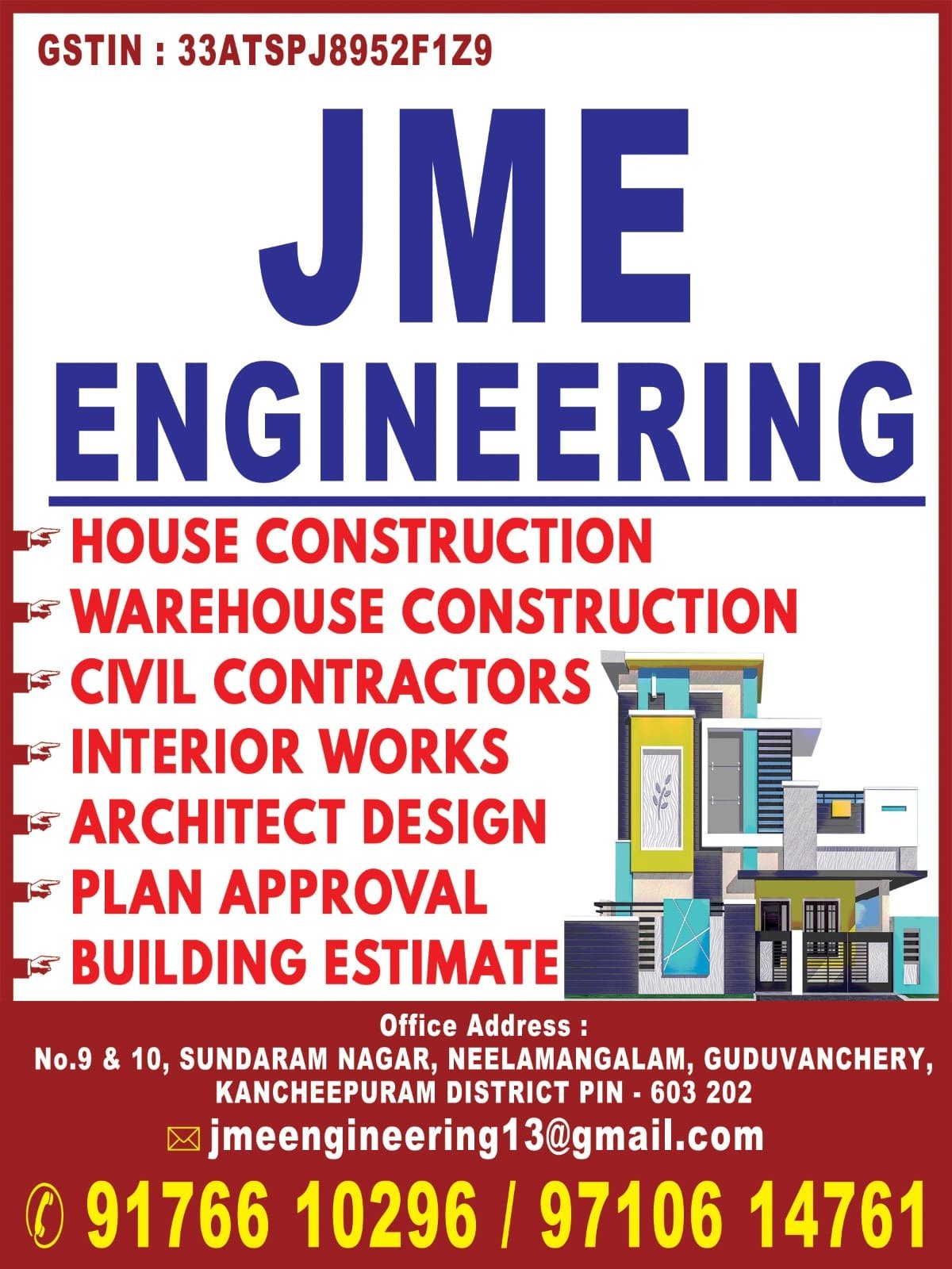 நாங்கள் ஹவுஸ் கன்ஸ்ட்ரக்ஷன், வெர்ஹவுஸ் கன்ஸ்ட்ரக்ஷன், சிவில் காண்ட்ராக்டர், இன்டீரியர் ஒர்க்ஸ், அர்கிடெக் டிசைன், பிளான் ஆஃப்ரூவல் , மற்றும் பில்டிங் எஸ்டிமேட் உள்ளிட்ட அனைத்து வகையான இன்ஜினியரிங் வேலைகளும் சிறந்த முறையில் குறித்த நேரத்தில் செய்து தருகிறோம்.