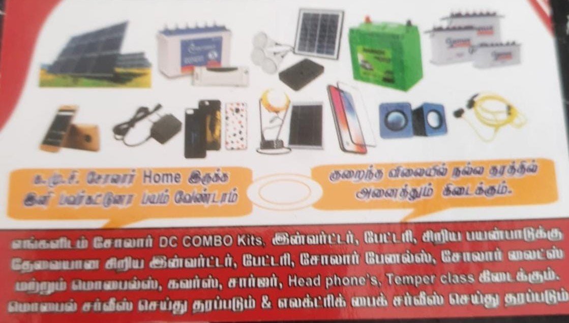 நாங்கள் பல்வேறு வகையான உயர்தர சோலார் DC காம்போ கிட்ஸ், இன்வெர்ட்டர் & பேட்டரி, சிறிய பயன்பாட்டுக்கு தேவையான சிறிய இன்வெர்ட்டர் & பேட்டரி, சோலார் பேனல்ஸ், சோலார் லைட்ஸ், மொபைல்ஸ், மொபைல் கவர்ஸ், ஹெட் போன்கள், மற்றும் டெம்பர் கிளாஸ் உள்ளிட்ட அனைத்தும் குறைந்த விலையில் நிறைந்த தரத்தில் கிடைக்கும்.