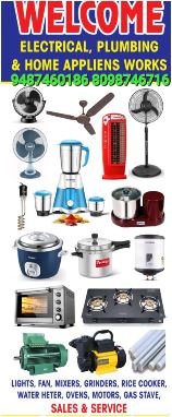 மேலும் எங்களிடம் லைட், ஃபேன், மிக்சர்கள், கிரைண்டர்கள், ரைஸ் குக்கர், வாட்டர் ஹீட்டர், ஓவன்கள், மோட்டார்கள் மற்றும் கேஸ் ஸ்டவ் உள்ளிட்ட அனைத்து வகையான வீட்டு உபோயோக பொருட்களும் சிறந்த முறையில் சேல்ஸ் மற்றும் சர்வீஸ் செய்து தரப்படும்.