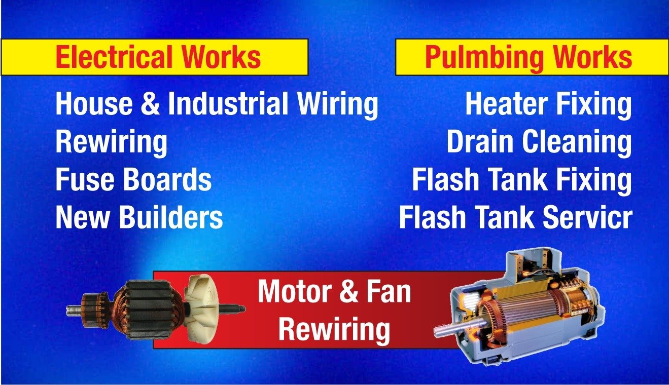 எங்களிடம் குடியிருப்பு மற்றும் வணிக கட்டிடங்கள்ளுக்கு தேவையான ஹவுஸ் & இண்டஸ்ட்ரியல் ஓயரிங் ஒர்க்ஸ், ரீஓயரிங், பியூஸ் போர்ட்ஸ் சர்வீஸ், நியூ பில்டர்ஸ், மோட்டோர் & பேன் ரீவைண்டிங் , ஹீட்டர் பிக்சிங், ட்ரைன் கிளீனிங், பிளாஷ் டேங்க் பிக்சிங், மற்றும் பிளாஷ் சர்வீஸ் உள்ளிட்ட அனைத்து வகையான எலக்ட்ரிகல் மற்றும் பிளம்பிங் வேலைகளும் சிறந்த முறையில் செய்து தரப்படும்.