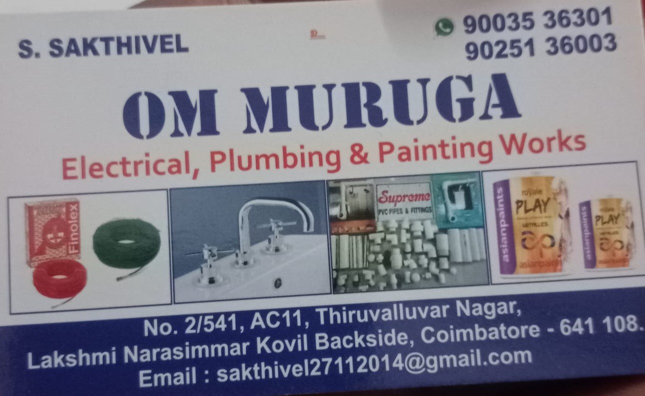 Om Muruga Electrical Plumbing & Painting Works is promoted by S.Sakthivel at Coimbatore. We work hard to provide excellent customer service to all our clients.