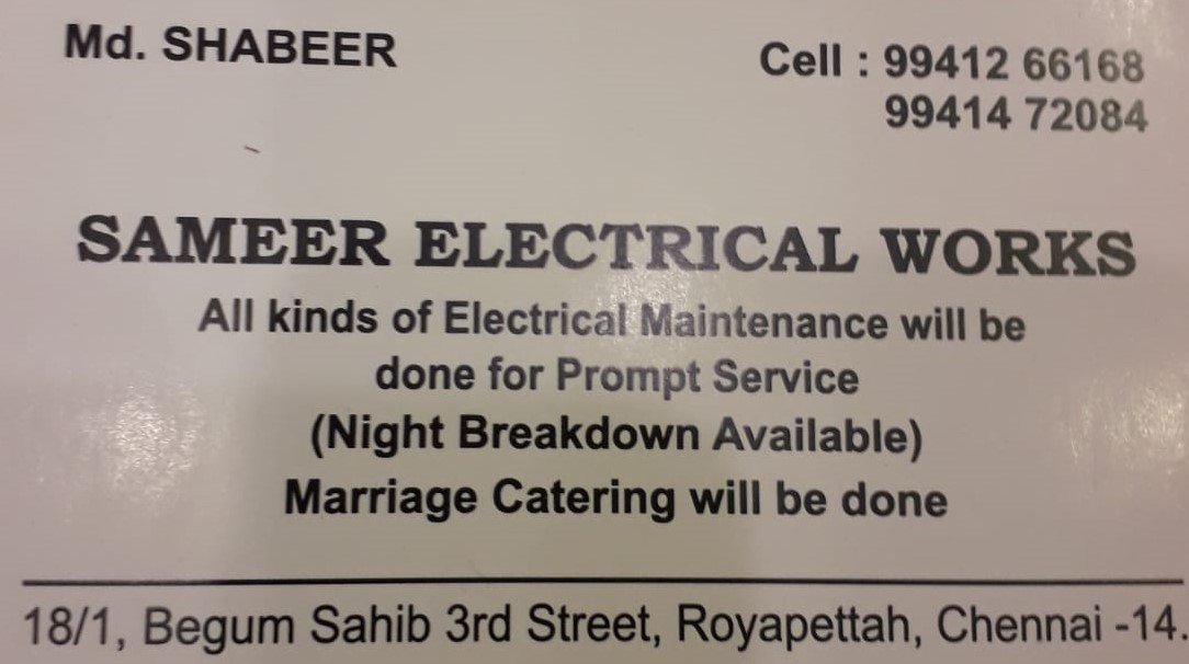 Sameer Electrical Works is promoted by Md.Shabeer at Chennai. We work hard to provide excellent customer service to all our clients.