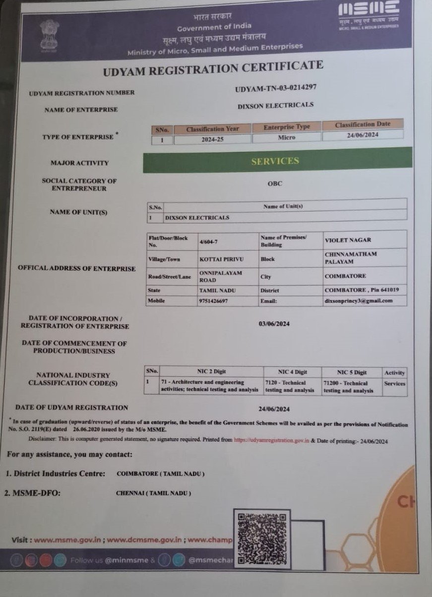 Dixson Electricals is promoted by Dixson at Coimbatore. We work hard to provide excellent customer service to all our clients.