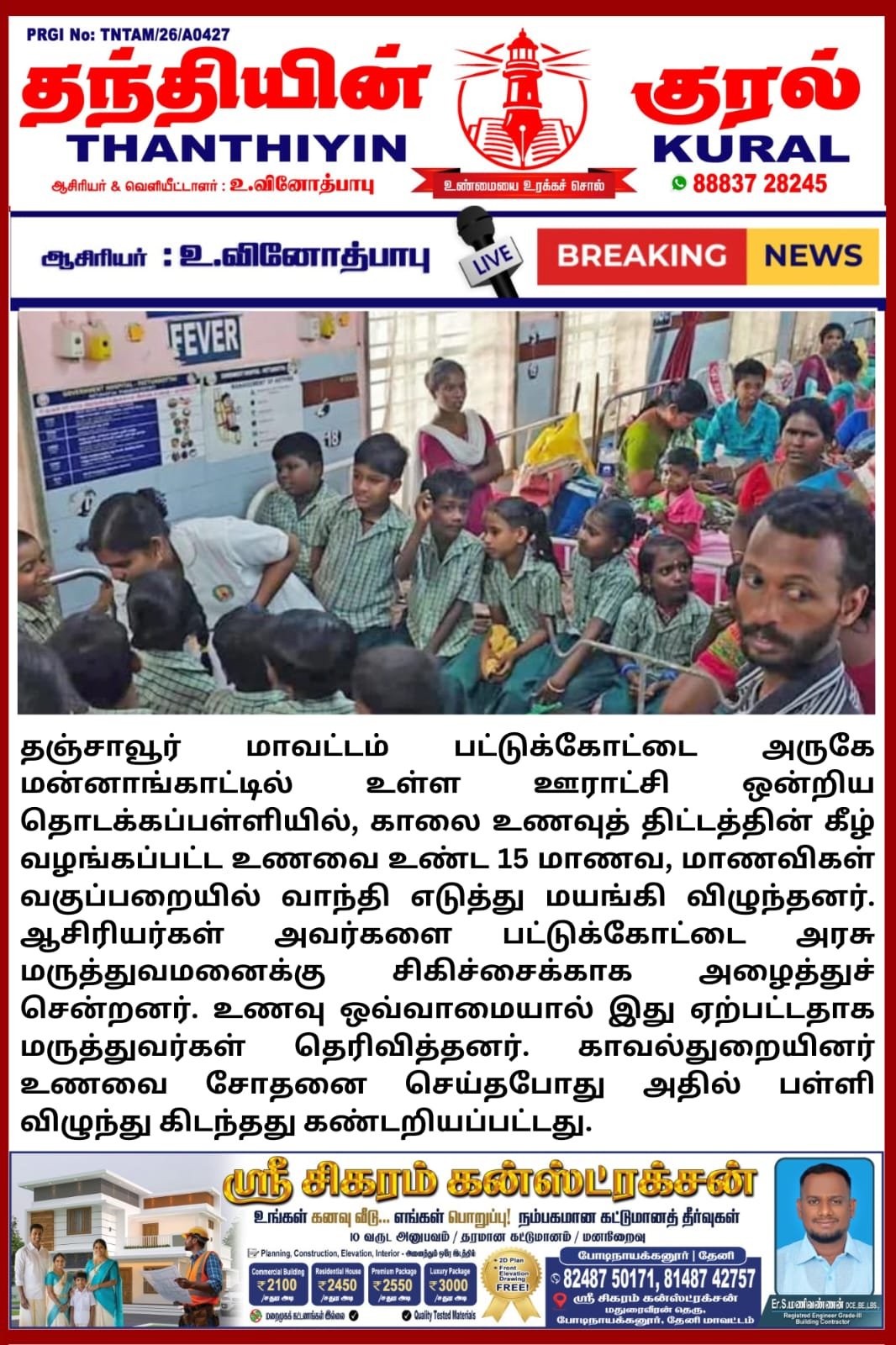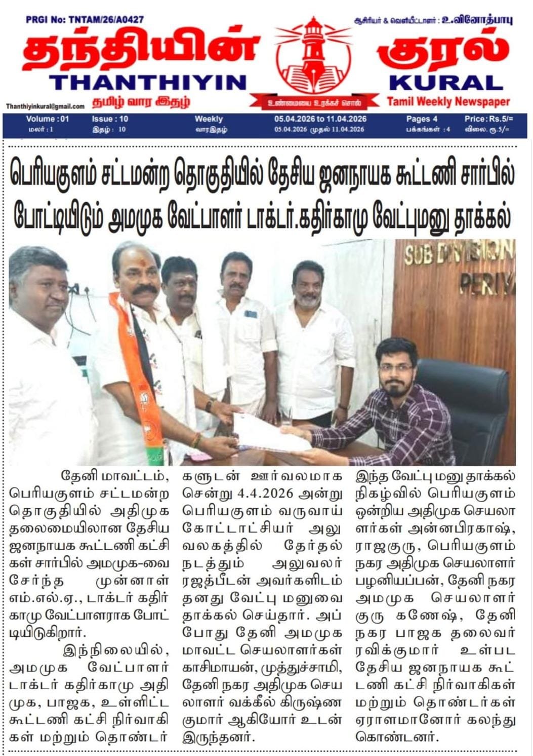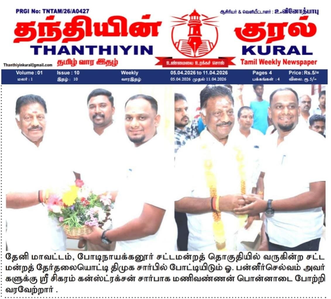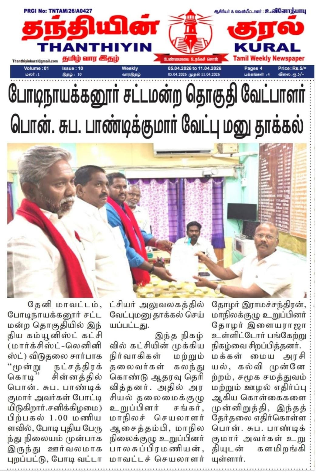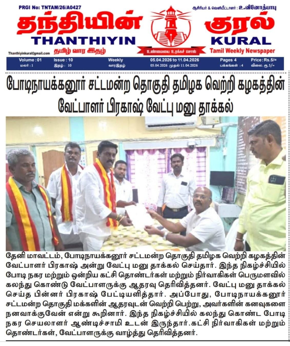 Welcome to Thanthiyin Kural, the trusted Tamil newspaper that has become an integral part of daily life in Theni. With a strong commitment to journalistic excellence, we deliver comprehensive coverage across diverse topics including:
