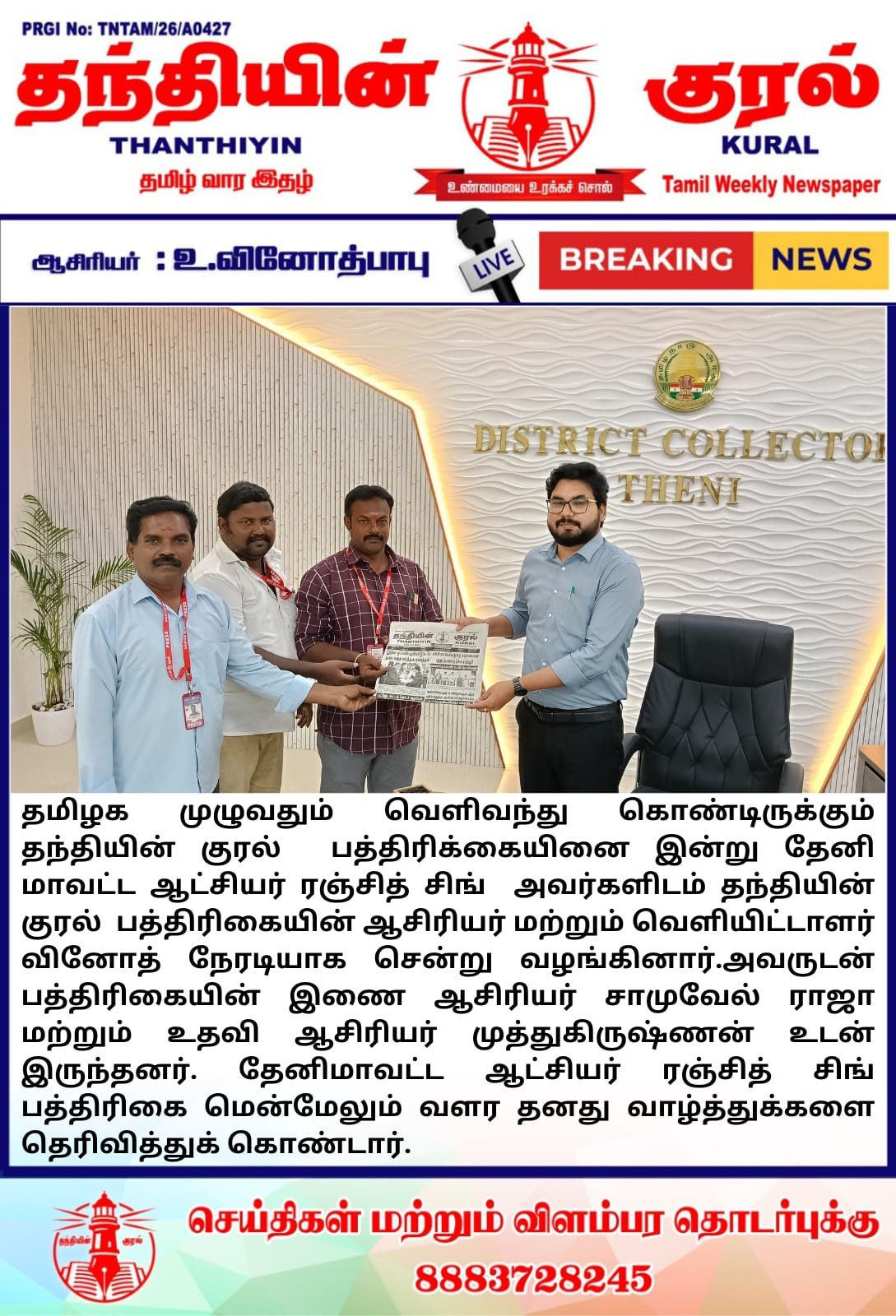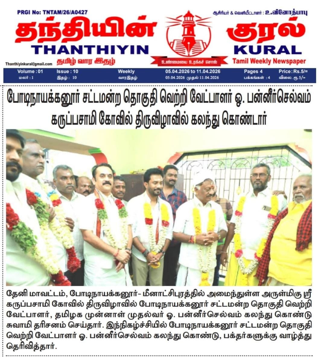 Thanthiyin Kural Weekly News Paper is promoted by U.Vinothbabu at Theni. We work hard to provide excellent customer service to all our clients.