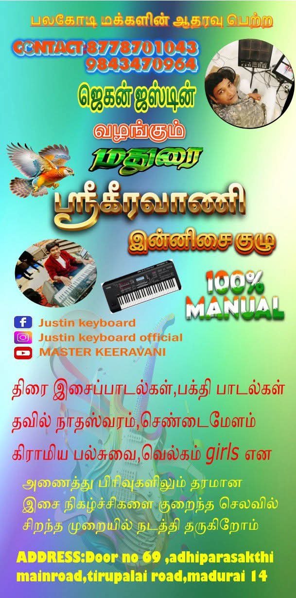 பலகோடி மக்களின் ஆதரவு பெற்ற ஜெகன் ஜஸ்டின் வழங்கும் மதுரை ஸ்ரீ கீரவாணி இன்னிசை குழுவிற்க்கு உங்களை வரவேற்கிறோம்!