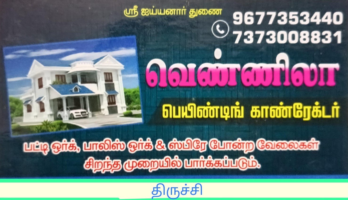 நாங்கள் புதிய கட்டிட பெயிண்டிங், ரீ-பெயிண்டிங், இன்டிரியர் & எக்ஸ்டிரியர் பெயிண்டிங் ஒர்க்ஸ், வால் டிசைனிங் ஒர்க்ஸ், பட்டி ஒர்க்ஸ் , பாலிஷ் ஒர்க்ஸ், ஸ்பிரே பெயிண்டிங் மற்றும் பல உள்ளிட்ட அனைத்து வகையான பெயிண்டிங் ஒர்க்ஸ் சிறந்த முறையில் செய்துதரப்படும்.