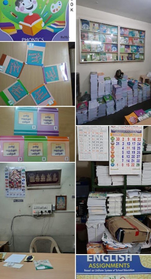 எங்களிடம் உயர்தரமான எல்.கே.ஜி முதல் மெட்ரிக் வரையிலான பள்ளி புத்தகங்கள், பெல்ட்கள், டைகள், பேட்ஜ்கள், துணி பேட்ஜ்கள், சாக்ஸ், டைரிகள், டி-சர்ட்கள் மற்றும் சமச்சீர் தேர்வு வினாத்தாள்கள் உள்ளிட்ட அனைத்தும் சிறந்த முறையில் கிடைக்கும்.