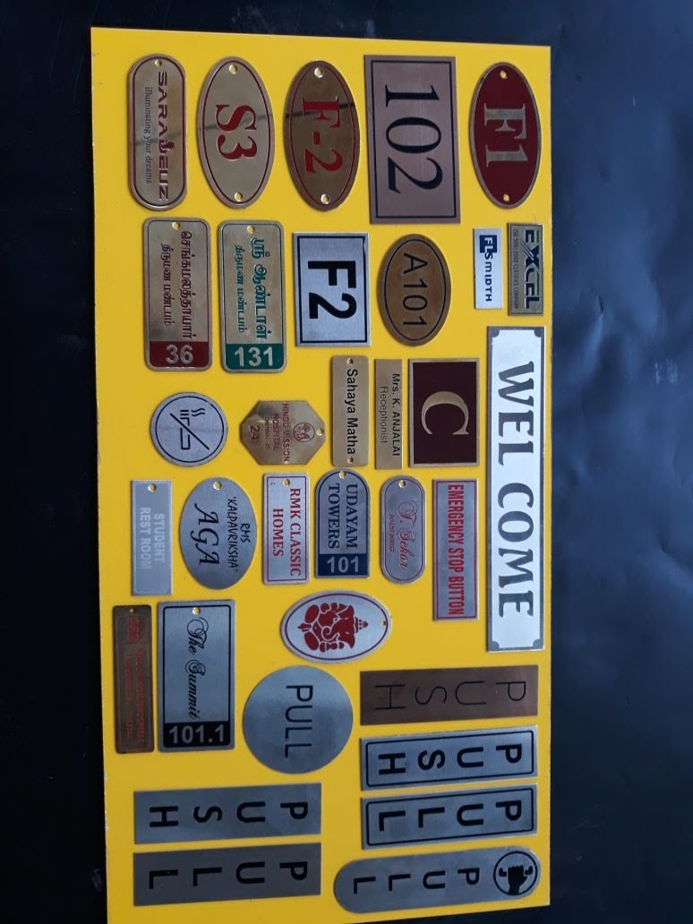 We make all types of Sign Boards at best. We provide LED Sign Board, Neon Sign, Mattel Letters, Wall Branding, Brass Letters, Aluminium Letters, SS Letters, Acrylic Letters, Brass & Steel Etching Plates, SS & Brass Key Chains, Laser Cutting etc.