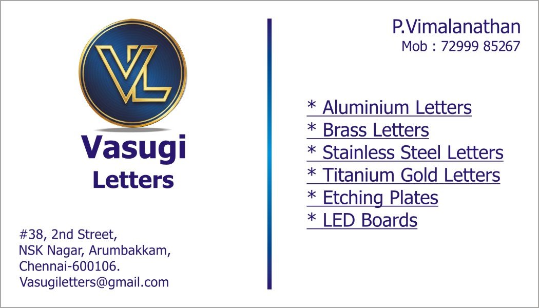 Vasugi Letters is promoted by P.Vimal at Chennai. We work hard to provide excellent customer service to all our clients.