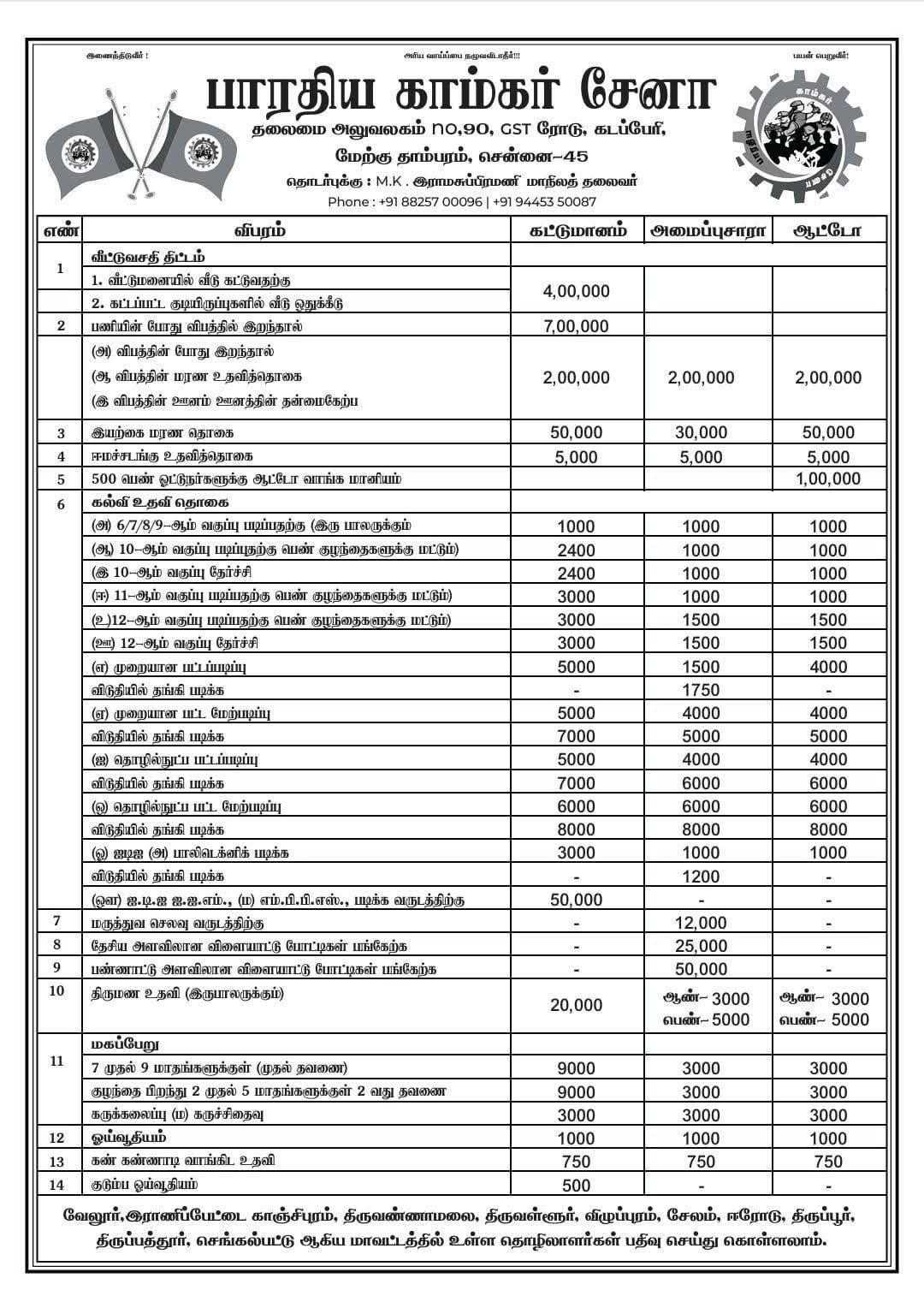 Welcome to Bharatiya Kamgar Sena, a dedicated organization committed to uplifting the lives of workers and their families. Under the leadership of State President M.K. Ramasubramani, we provide a wide range of welfare services designed to support workers across Tamil Nadu.