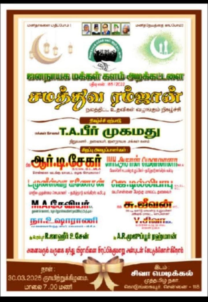 Jananayaka Makkal Kalam Arakattalai is promoted by T.A. Peer Mohamed Chairman, Founder at Chennai. We work hard to provide excellent customer service to all our clients.