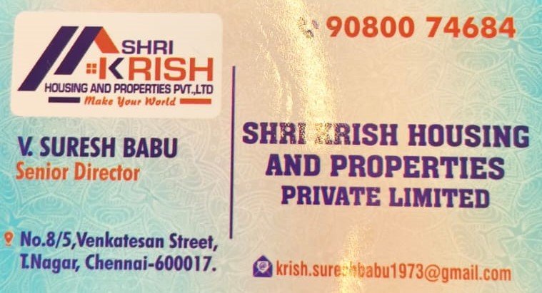 Shri Krish Housing and Properties Private Limited is promoted by V.Suresh Babu at Chennai. We work hard to provide excellent customer service to all our clients.