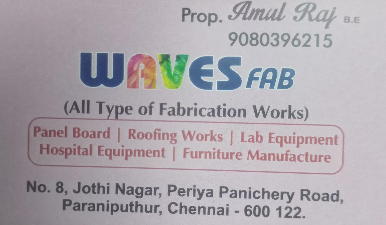 Waves Fab is promoted by Amul Raj at Chennai. We work hard to provide excellent customer service to all our clients.