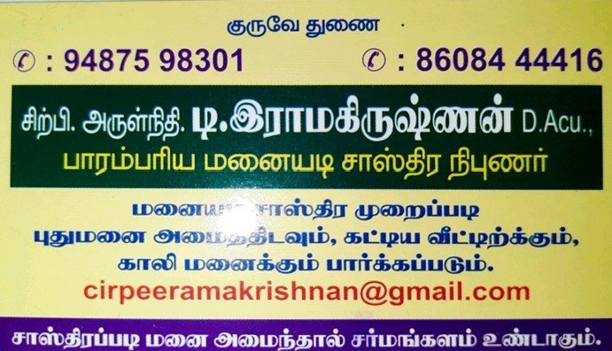 Ramakrishnan Parampariya Manaiyadi Sasthira Nibunar is promoted by T.Ramakrishnan at Udumalaipetta. We work hard to provide excellent customer service to all our clients.