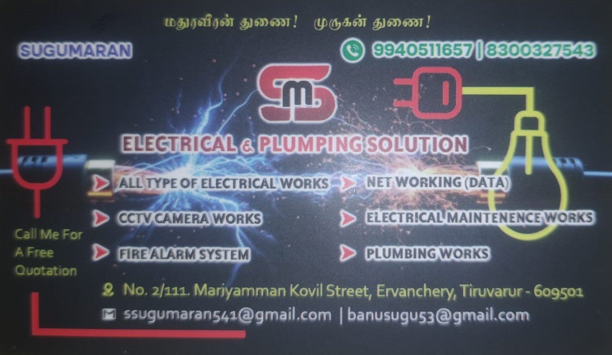 SM Electrical & Plumbing Solution is promoted by Sugumaran at Tiruvarur. We work hard to provide excellent customer service to all our clients.