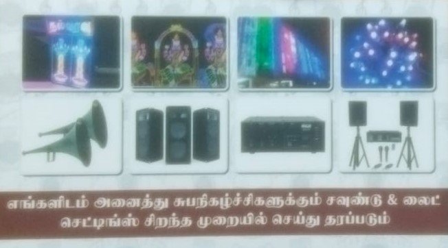 மேலும் நாங்கள் அனைத்து சுபநிகழிச்சிகளுக்கும் சவுண்ட் மற்றும் லைட் செட்டிங்ஸ் சிறந்த முறையில் செய்து தருகிறோம்.