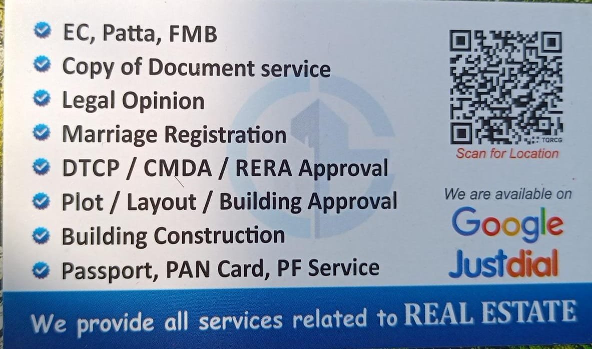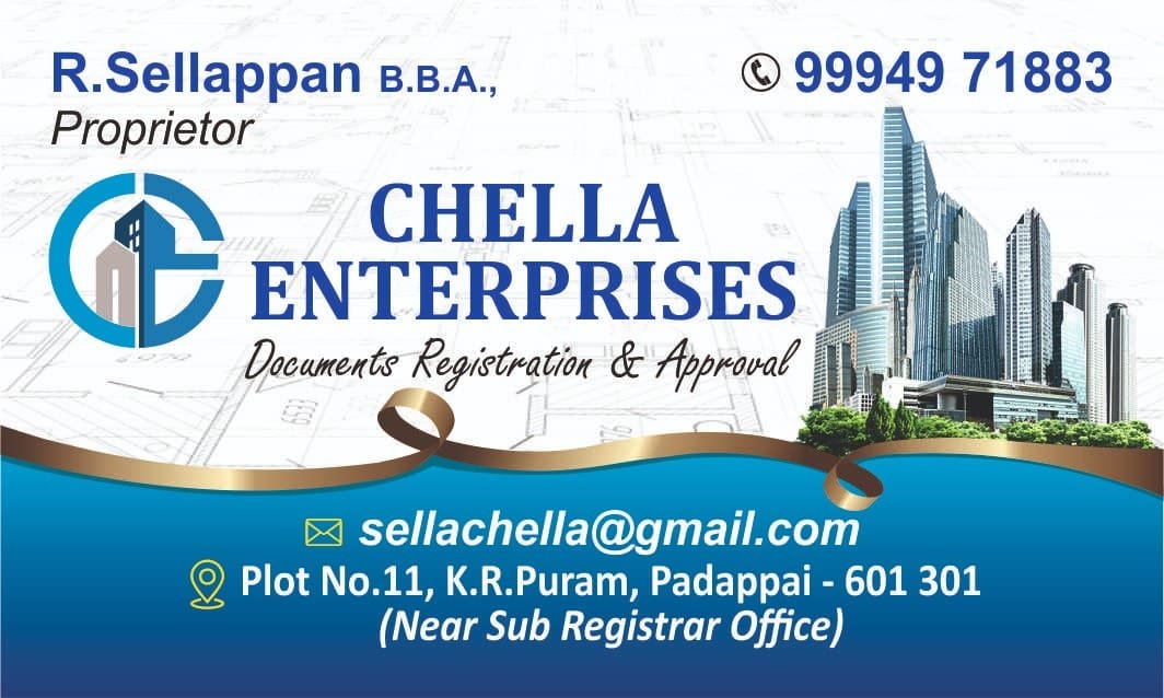Welcome to Chella Enterprises, your trusted one-stop destination for Document Registration, Approval Services, and Real Estate solutions in Padappai. With a commitment to professionalism, reliability, and customer satisfaction, we provide a wide range of services to meet your personal, legal, and property needs.