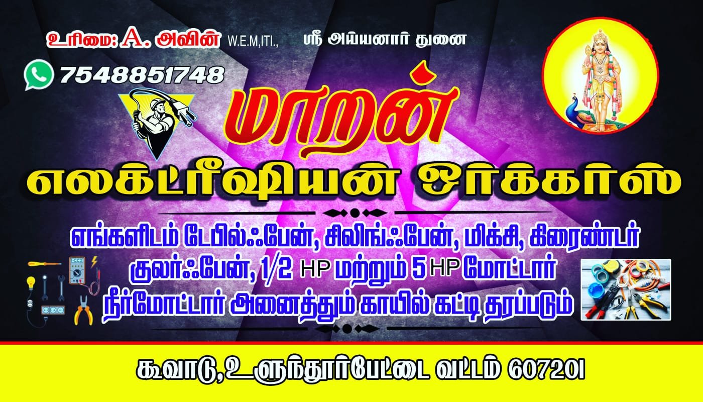 Maran Electrician Works is promoted by A.Avin at Ulundurpettai. We work hard to provide excellent customer service to all our clients.