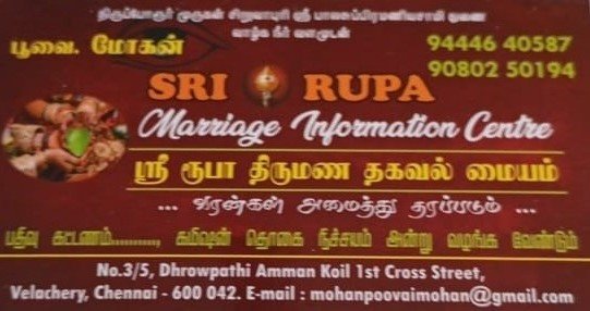 Sri Rupa Marriage Information Centre is promoted by Mohan at Chennai. We work hard to provide excellent customer service to all our clients.