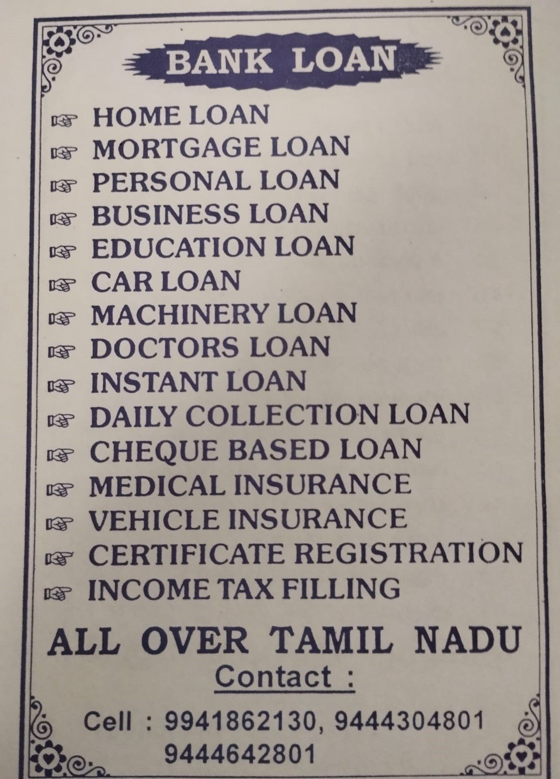 நாங்கள் தனி நபர் கடன், வணிக கடன், வீட்டு கடன், கார் கடன், மோட்டரேஜ் கடன், கல்வி கடன், டாக்டர்ஸ் / ஆடிட்டர்ஸ் கடன், மிஷினரி கடன், இன்ஸ்டன்ட் கடன், டெய்லி கலக்சன் கடன், செக் பேஸ்ட் கடன், மருத்துவ காப்பீடு, ஹெல்த் இன்சூரன்ஸ், வாகன இன்சூரன்ஸ், சர்டிபிகட் பதிவு, வருமான வரி பில்லிங் மற்றும் பல போன்ற அனைத்து பைனான்சியல் சேவைகளும் சிறப்பாக செய்து தருகிறோம்.