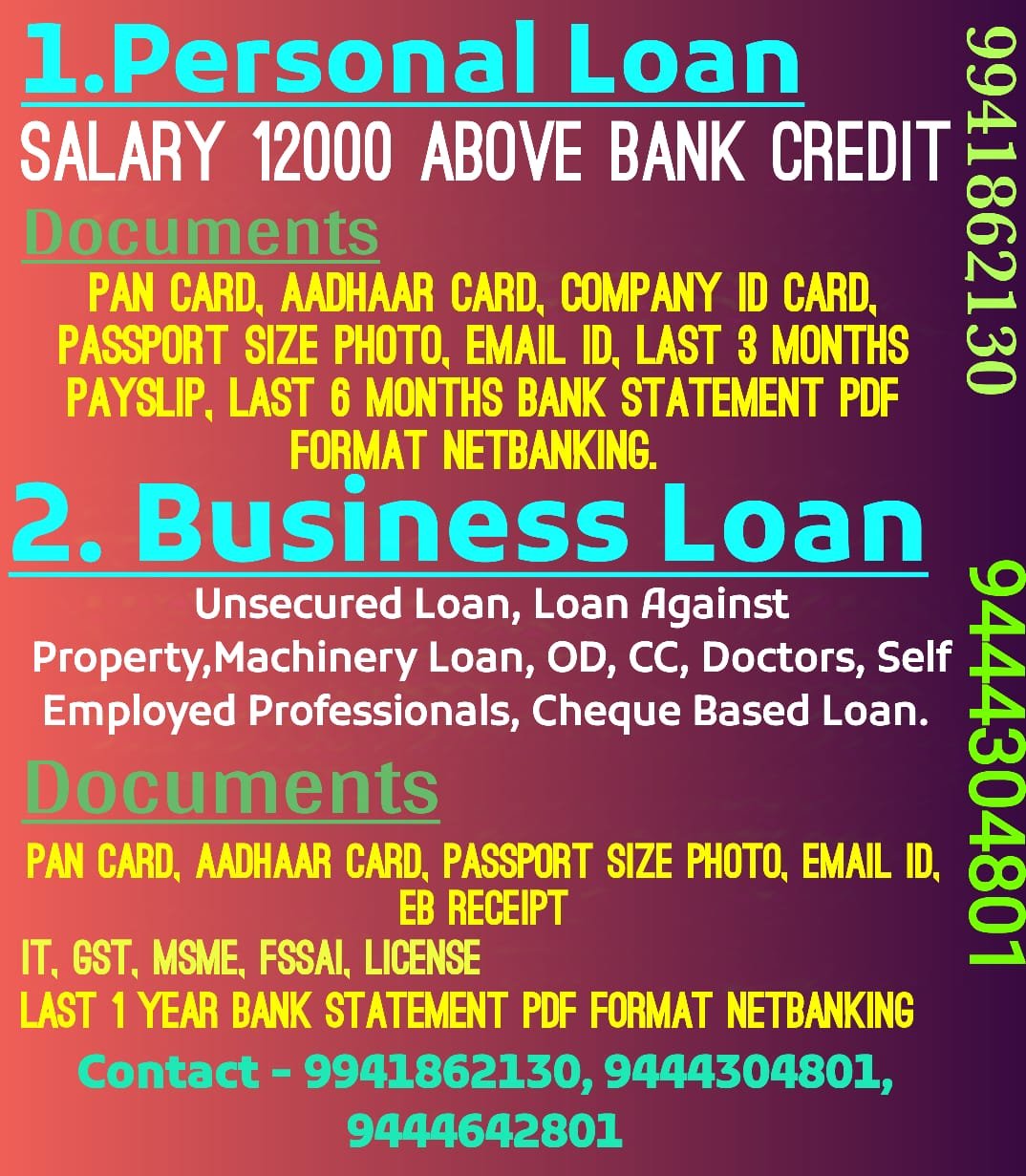 Tag: Home Loan, Motrgage Loan, Personal Loans, Business Loans, Educational Loan, Car Loans, Machinery Loan, Doctors / Auditors Loan, Instant Loan, Daily Collection Loan, Cheque Based Loan, Medical Insurance, Vehicle Insurance, Health Insurance, Certificate Registration, Income Tax Filling
