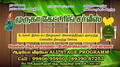 சென்னையில் உங்கள் கேட்டரிங் தேவைகளுக்கான சிறந்த தேர்வான முருகா கேட்டரிங் சர்வீஸுக்கு உங்களை இனிதே வரவேற்கிறோம்!