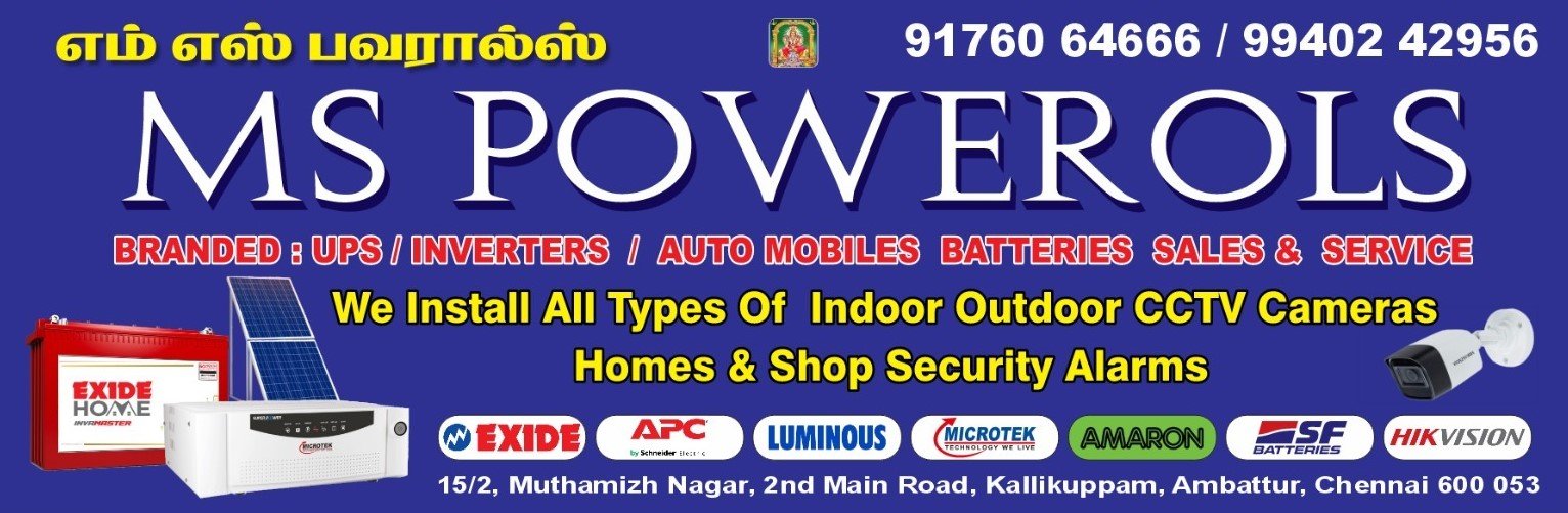 நாங்கள் குடியிருப்பு மற்றும் வணிக கட்டிடங்களுக்கு தேவையான அனுபவம் வாய்ந்த தொழில்நுட்ப வல்லுநர்களை கொண்டு உயர்தரமான UPS, இன்வெர்ட்டர்கள், ஆட்டோ மொபைல் பேட்டரிகள், இன்டோர் & அவுட்டோர் CCTV கேமராக்கள் நிறுவல் மற்றும் செக்யூரிட்டி அலாரங்கள் உள்ளிட்ட அனைத்து பொருட்களையும் சிறந்த முறையில் சேல்ஸ் மற்றும் சர்வீஸ் செய்து தருகிறோம்.